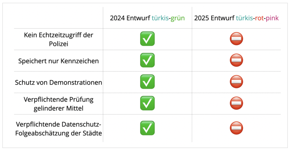 Vor diesem Hintergrund ist es interessant, dass Minister Hanke in seinem Entwurf nun auch nicht mehr von den Städten verlangt, dass gelinderen Mitteln zur Verkehrsberuhigung (Reduktion der Parkplätze, Durchfahrtsregeln, etc.) der Vorzug gegeben werden muss. Auch eine Datenschutzfolgeabschätzung ob die Kameras verhältnismäßig sind, ist nicht mehr vorgeschrieben, sondern nur noch generisch in den Erläuterungen enthalten.