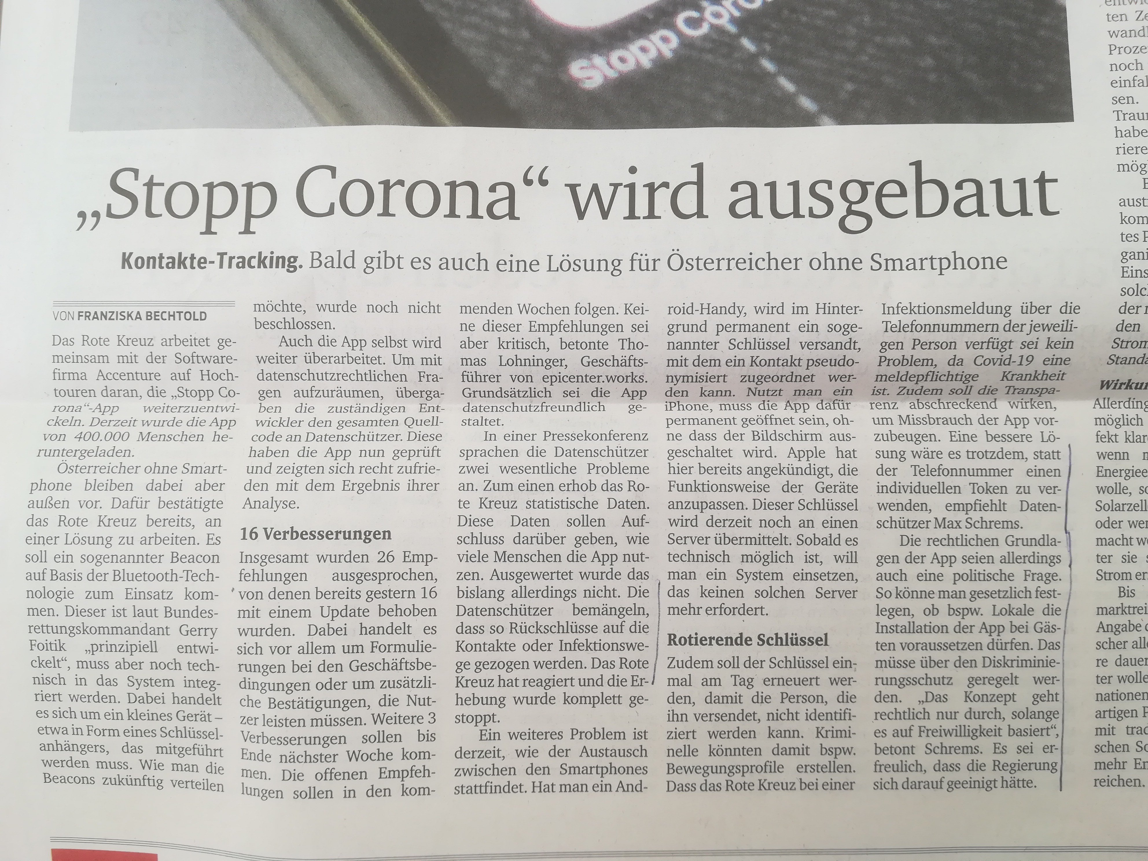 | „Gutes Ausgangsniveau“: Persilschein für „Stopp Corona“-App | 23.04.2020 | Tiroler Tageszeitung | Web | Ja | |