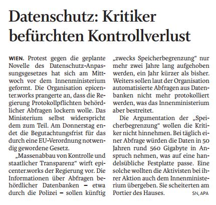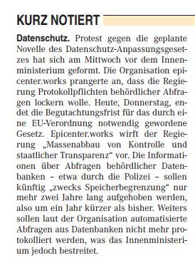 | Datenschutz: Protest vor Innenministerium | 07.02.2018 | Wiener Zeitung | Web | Ja | |