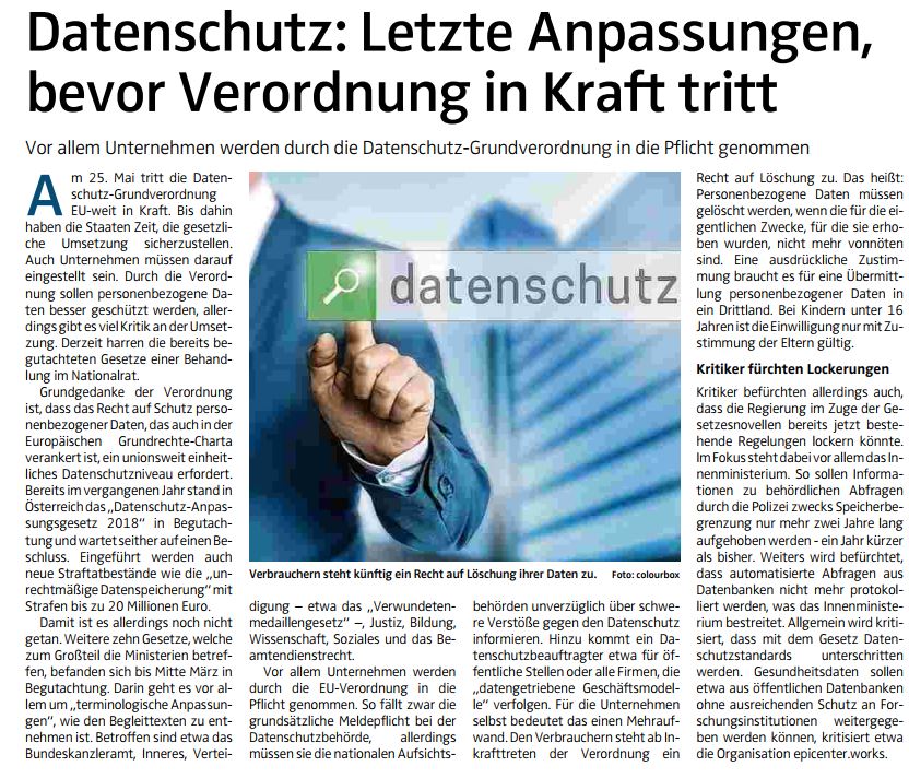 | Datenschutz: Letzte Anpassungen, bevor Verordnung in Kraft tritt | 31.03.2018 | Oberösterreichische Nachrichten | Seite 31 | Ja | |