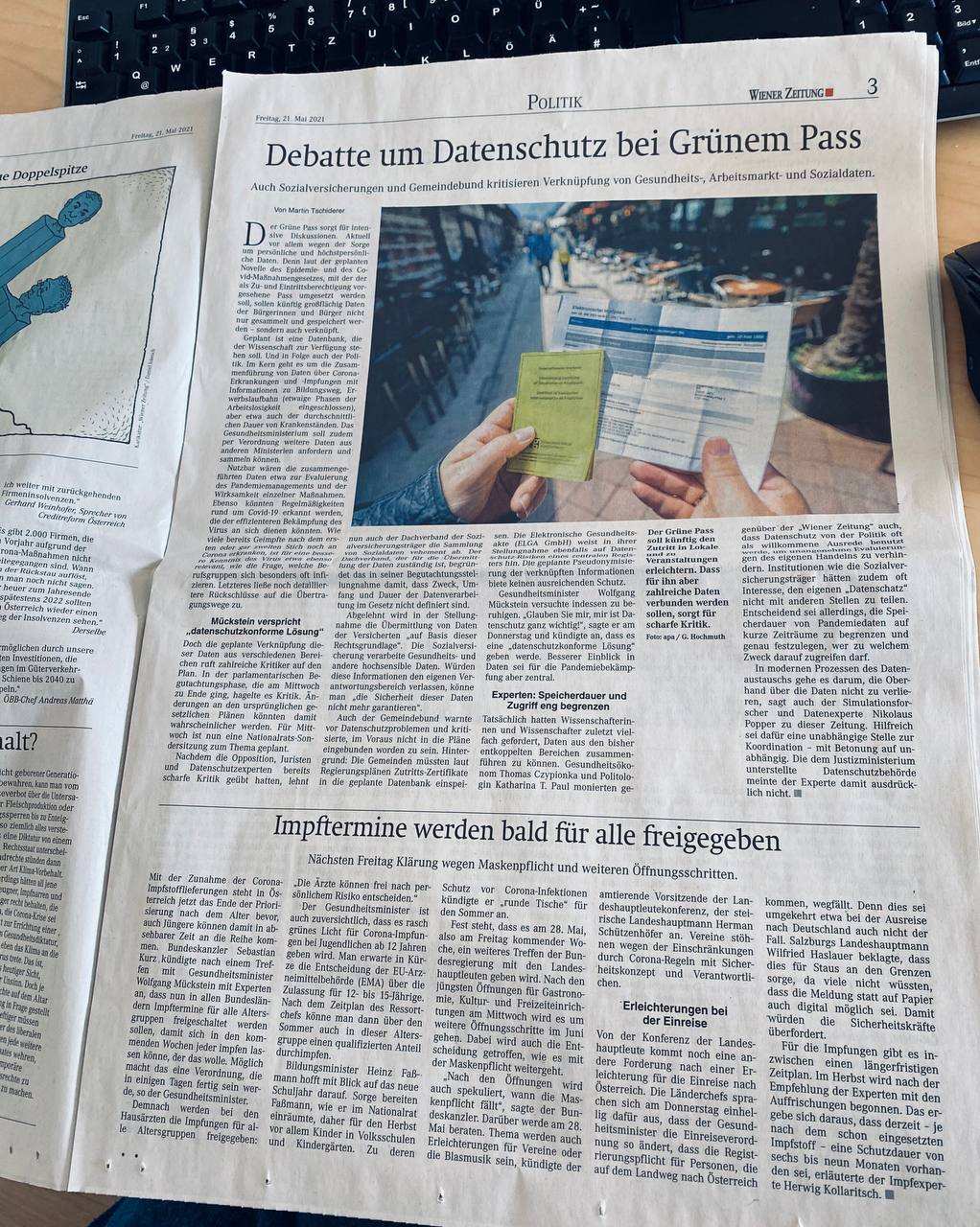 | Debatte um Datenschutz beim Grünen Pass | 21.05.2021 | Wiener Zeitung | Ja |