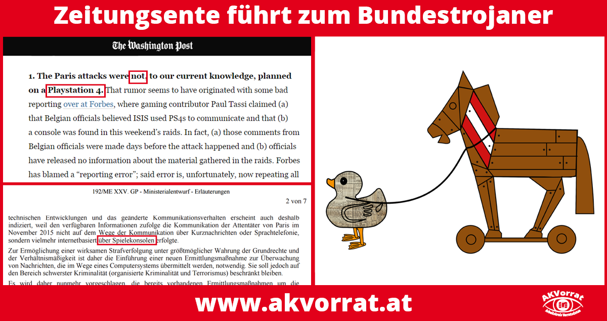 Heute veröffentlicht der AKVorrat seine Stellungnahme zum Vorschlag von Justizminister Brandstetter, eine staatliche Überwachungssoftware (Bundestrojaner) einzuführen. Die detaillierte juristische und technische Stellungnahme zeigt, warum diese Anlassgesetzgebung mehr Probleme bereitet als sie lösen kann.