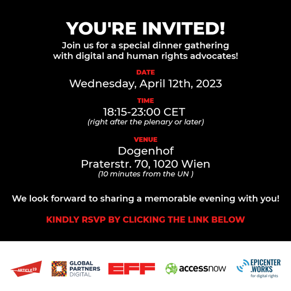 We are organizing a dinner with delegations and representatives of civil society during the UN Cybercrime Convention negotiations.